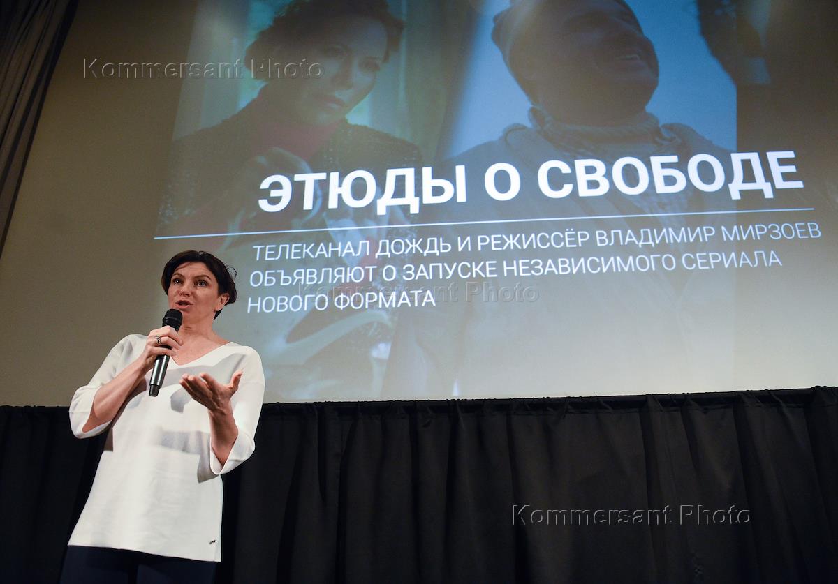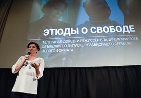 Закрытый показ независимого сериала нового формата "Этюды о свободе" телеканала "Дождь" в Центре Документального кино. Генеральный продюсер медиахолдинга "Дождь" Наталья Синдеева на показе.