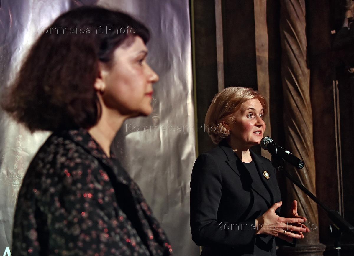 Церемония открытия выставки "Эпоха Рембрандта и Вермеера. Шедевры Лейденской коллекции" в Государственной Музее изобразительных искусств (ГМИИ) имени А.С.Пушкина. Директор ГМИИ имени Пушкина Марина Лошак (слева) и заместитель председателя правительства России Ольга Голодец (справа) на церемонии.