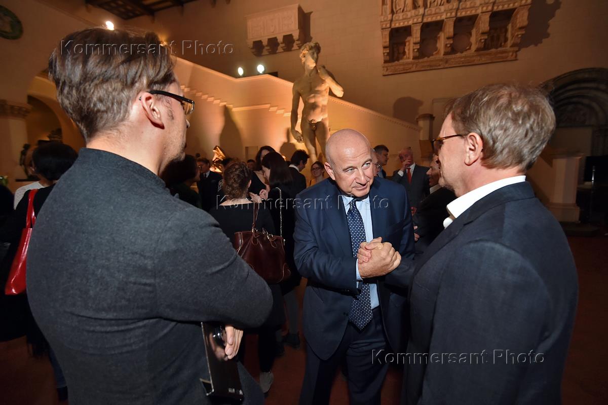 Церемония открытия выставки "Эпоха Рембрандта и Вермеера. Шедевры Лейденской коллекции" в Государственной Музее изобразительных искусств (ГМИИ) имени А.С.Пушкина. Художник-карикатурист Андрей Бильжо (в центре) на церемонии.