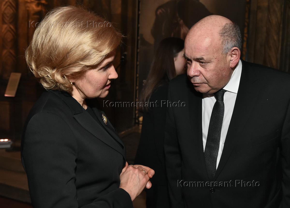 Церемония открытия выставки "Эпоха Рембрандта и Вермеера. Шедевры Лейденской коллекции" в Государственной Музее изобразительных искусств (ГМИИ) имени А.С.Пушкина. Заместитель председателя правительства России Ольга Голодец (слева) и специальный представитель президента России по международному культурному сотрудничеству, художественный руководитель Московского театра мюзикла Михаил Швыдкой (справа) на церемонии.