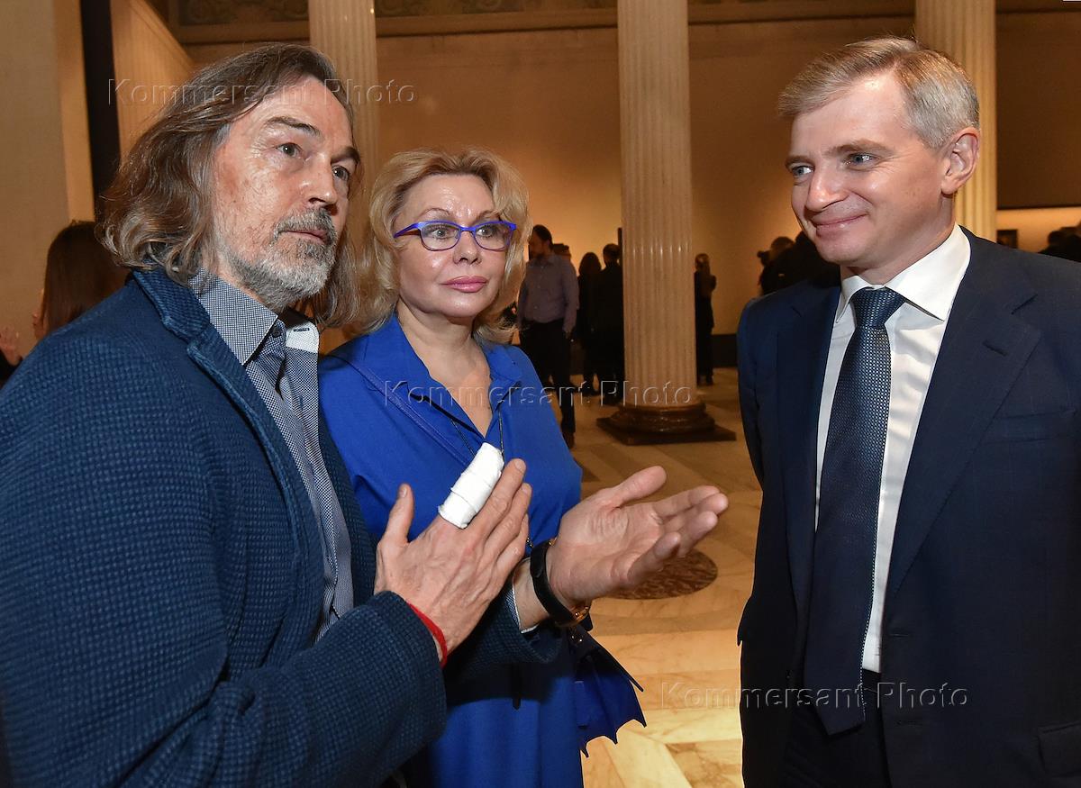 Церемония открытия выставки "Эпоха Рембрандта и Вермеера. Шедевры Лейденской коллекции" в Государственной Музее изобразительных искусств (ГМИИ) имени А.С.Пушкина. Слева направо: руководитель департамента культуры города Москвы Александр Кибовский, директор Мультимедиа Арт Музея Ольга Свиблова и руководитель компании "Уникум" Борис Белоцерковский на церемонии.