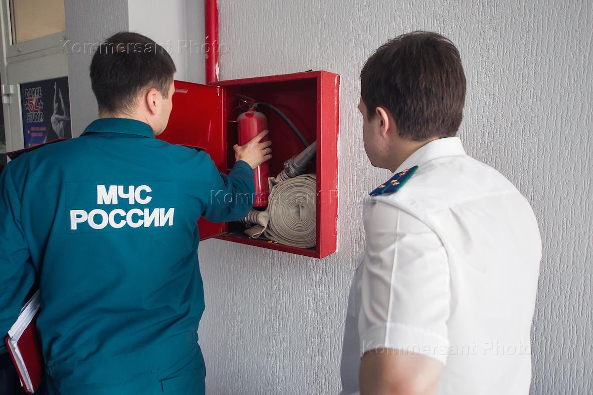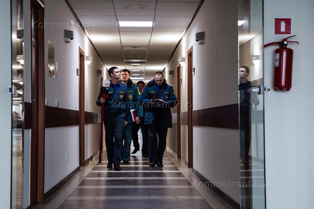 Сотрудники МЧС России во время проверки на соответствие городских торговых центров требованиям и правилам пожарной безопасности.