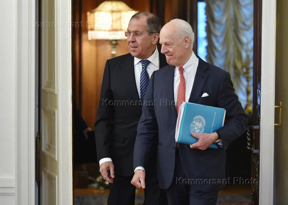 Специальный представитель генерального секретаря ООН по Сирии Стаффан де Мистура (слева) и министр иностранных дел России Сергей Лавров (справа) во время встречи в Доме приемов МИД России.