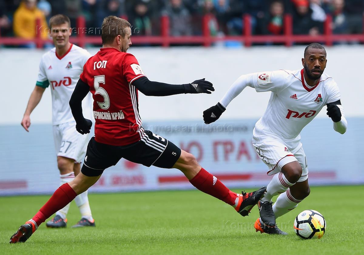 РОСГОССТРАХ. Чемпионат России по футболу 2017/2018. 24-й тур. Матч между командами "Амкар" (Пермь) - "Локомотив" (Москва) прошел на стадионе "РЖД Арена". Игрок команды "Амкар" Павел Комолов (справа) во время матча.