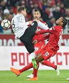 РОСГОССТРАХ Чемпионат России по футболу 2017/2018. 24-й тур. Матч между командами "Спартак" (Москва) и "Тосно" (Тосно, Ленинградская обл.) прошел на стадионе "Открытие Арена". Игрок команды "Спартак" Александр Самедов (слева) и игрок команды "Тосно" Андрей Буйволов (справа) во время матча.