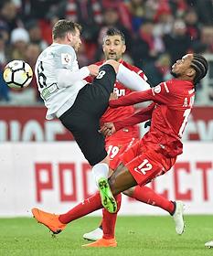 РОСГОССТРАХ Чемпионат России по футболу 2017/2018. 24-й тур. Матч между командами "Спартак" (Москва) и "Тосно" (Тосно, Ленинградская обл.) прошел на стадионе "Открытие Арена". Игорок команды "Тосно" Александр Карницкий (в центре) во время матча.