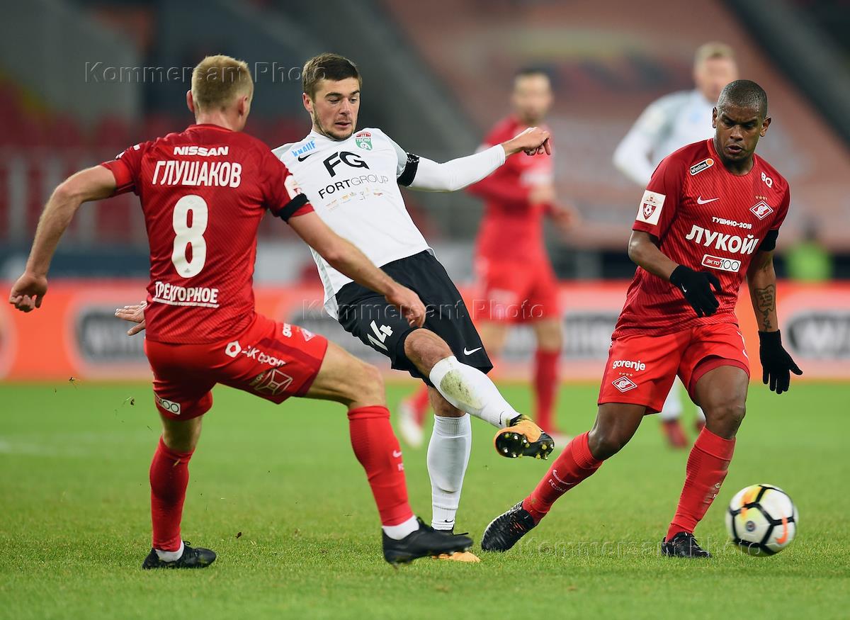 РОСГОССТРАХ Чемпионат России по футболу 2017/2018. 24-й тур. Матч между командами "Спартак" (Москва) и "Тосно" (Тосно, Ленинградская обл.) прошел на стадионе "Открытие Арена". Игрок команды "Тосно" Тимофей Маргасов (справа) во время матча.