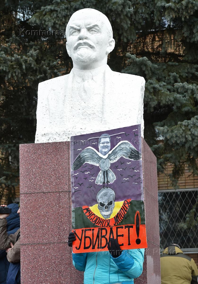 Митинг против полигона твердых коммунальных отходов "Ядрово" прошел на площади у здания администрации Волоколамского района. Участник митинга у памятника вождю революции Владимиру Ленину.
