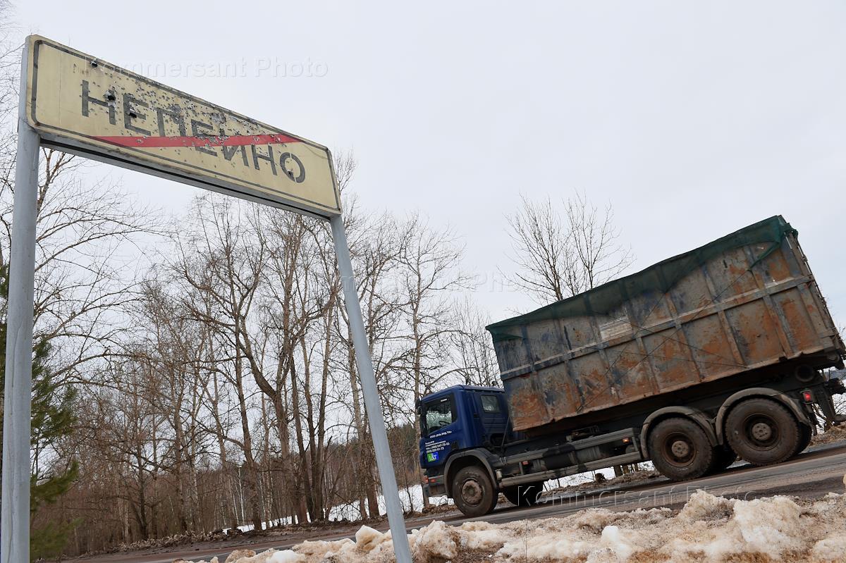 Полигон твердых бытовых отходов в Непейно. Мусоровоз на въезде в деревню.
