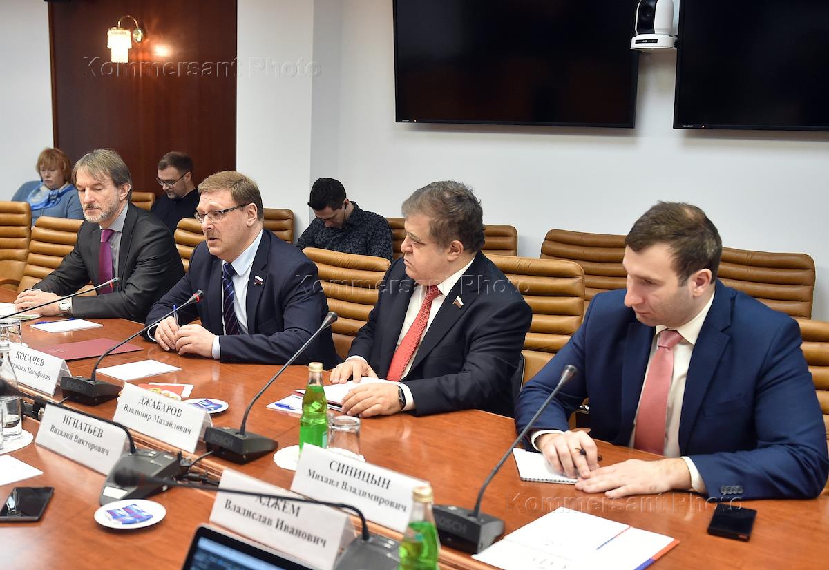 Слева направо: член Комитета Совета Федерации по международным делам Олег Ходырев, председатель Комитета Совета Федерации по международным делам Константин Косачев, первый заместитель председателя Комитета Совета Федерации по международным делам Владимир Джабаров и главный консультант аапарата Комитета Совета Федерации по международным делам Михаил Синицын во время встерчи с президентом непризнанной Приднестровской Молдавской Республики Вадимом Красносельским.
