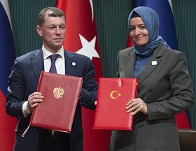 Рабочая поездка президента России Владимира Путина в Турцию. Министр труда и социальной защиты России Максим Топилин (слева) и министр по делам семьи и социальной политики Турецкой Республики Фатма Бетюль Саян Кая (справа) на церемонии подписания совместных документов по итогам российско-турецких переговоров во Дворце президента Турции.