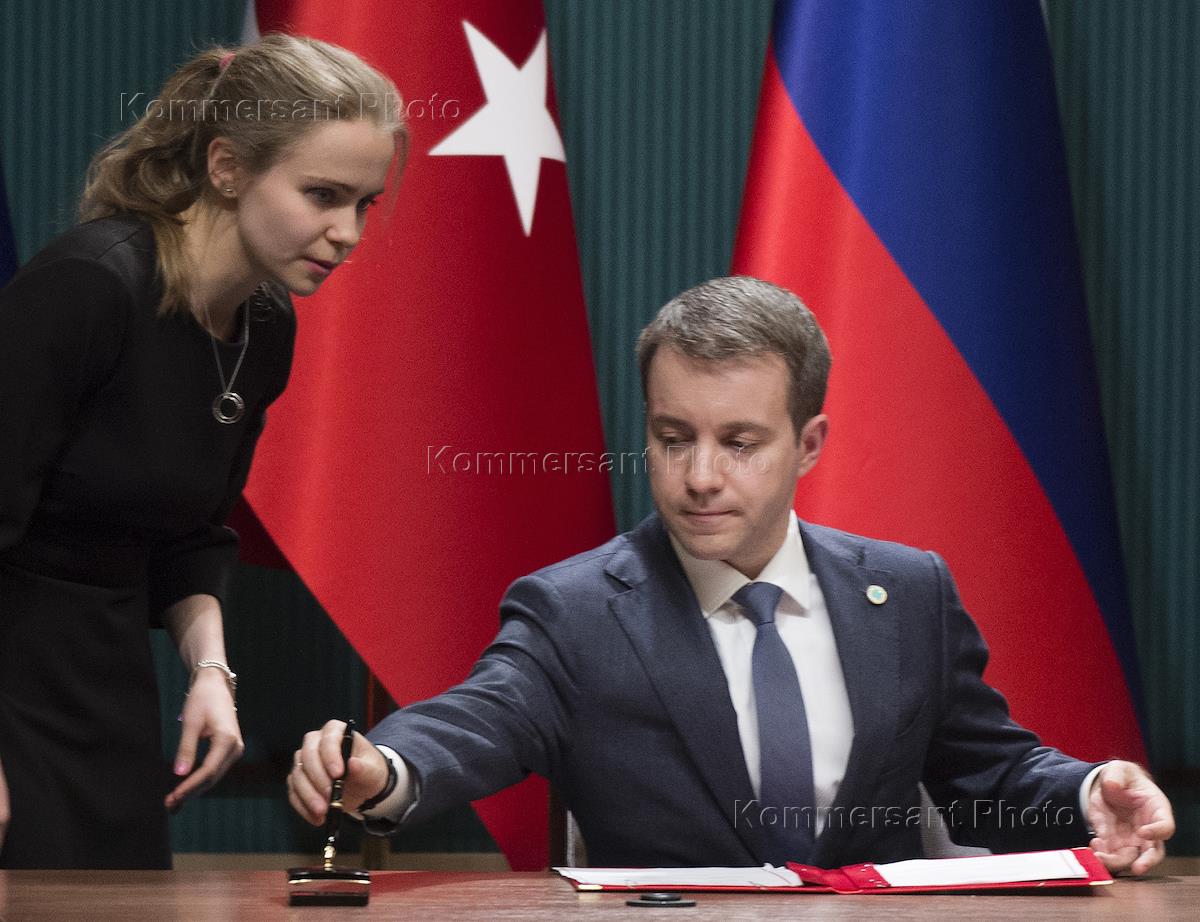 Рабочая поездка президента России Владимира Путина в Турцию. Министр труда и социальной защиты России Максим Топилин (слева) и министр по делам семьи и социальной политики Турецкой Республики Фатма Бетюль Саян Кая (справа) на церемонии подписания совместных документов по итогам российско-турецких переговоров во Дворце президента Турции.
