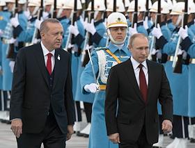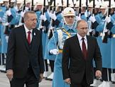 Рабочая поездка президента России Владимира Путина в Турцию. Президент России Владимир Путин (слева) и президент Турции Реджеп Тайип Эрдоган (справа) на церемонии официальной встречи на площади перед Дворцом президента Турции в Анкаре.
