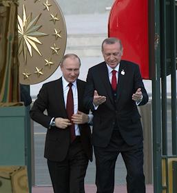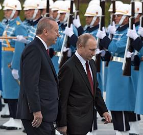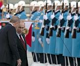 Рабочая поездка президента России Владимира Путина в Турцию. Президент России Владимир Путин (справа) и президент Турции Реджеп Тайип Эрдоган (слева) на церемонии официальной встречи на площади перед Дворцом президента Турции в Анкаре.