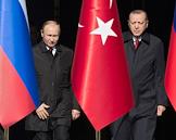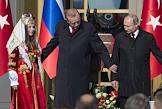 Рабочая поездка президента России Владимира Путина в Турцию. Президент России Владимир Путин (слева) и президент Турецкой Республики Реджеп Тайип Эрдоган (справа) во время совместной пресс-конференции по итогам встречи во Дворце президента Турции.