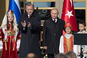 Рабочая поездка президента России Владимира Путина в Турцию. Президент России Владимир Путин (справа) и президент Турции Реджеп Тайип Эрдоган (слева) на церемонии запуска строительства первого энергоблока атомной электростанции (АЭС) "Аккую", сооружаемой "Росатомом" в Турции, в режиме видеоконференцсвязи у президентского дворца в Анкаре.