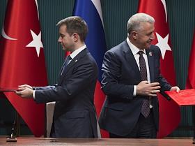 Рабочая поездка президента России Владимира Путина в Турцию. Министр связи и массовых коммуникаций России Николай Никифоров (слева) и министр транспорта, судоходства и коммуникаций Турецкой Республики Ахмет Арслан (справа) на церемонии подписания совместных документов по итогам российско-турецких переговоров во Дворце президента Турции.