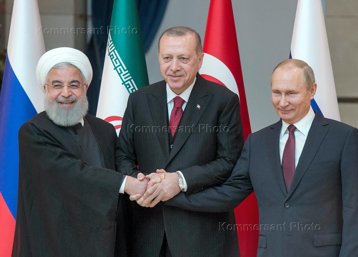 Рабочая поездка президента России Владимира Путина в Турцию. Слева направо: президент Ирана Хасан Рухани, президент Турции Реджеп Тайип Эрдоган и президент России Владимир Путин во время церемонии фотографирования во дворце президента Турецкой Республики.