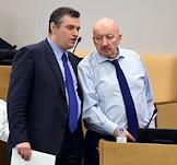 Пленарное заседание Государственной думы (ГД) России. Председатель комитета ГД России по международным делам Леонид Слуцкий (слева) и член комитета ГД России по образованию и науке Гаджимет Сафаралиев (справа) перед началом заседания.