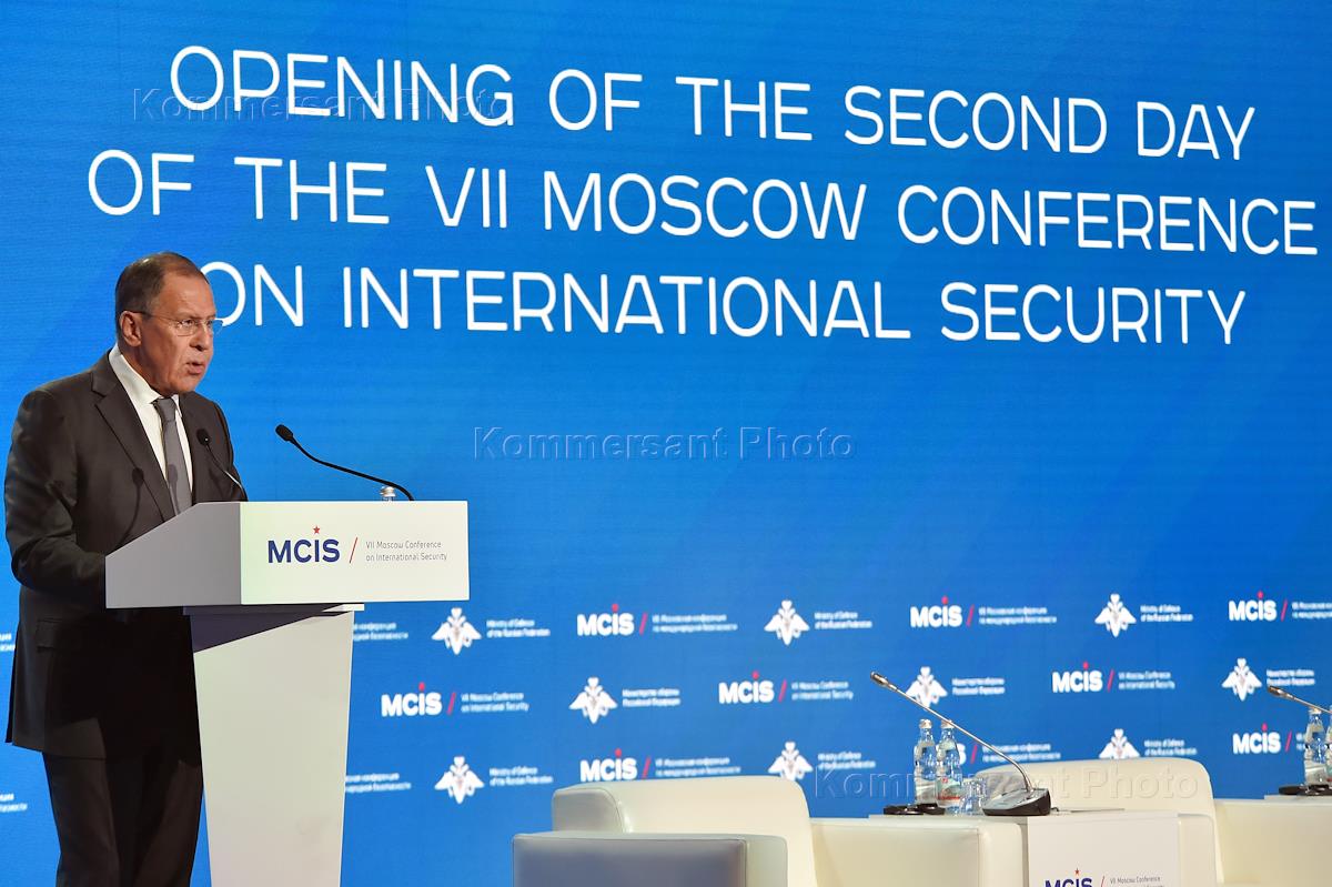 VII Московская конференция по международной безопасности (MCIS-2018) в гостинице Radisson Royal. Пленарное заседания "Азия: региональные аспекты безопасности". Министр иностранных дел России Сергей Лавров во время выступления на заседании.