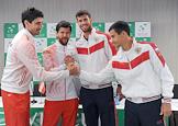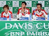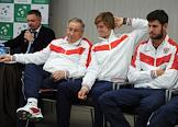 Жеребьевка матча Группы I (зона Европа/Африка) командного чемпионата мира между мужскими сборными командами на Кубок Дэвиса между сборными России и Австрии. Справа налево, игроки сборной команды Австрии: Филипп Освальд, Юрген Мельцер, Тристан Вайссборн, Себастьян Офнер и Деннис Новак во время жеребьевки.
