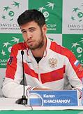Жеребьевка матча Группы I (зона Европа/Африка) командного чемпионата мира между мужскими сборными командами на Кубок Дэвиса между сборными России и Австрии. Игрок сборной России Карен Хачанов во время жеребьевки.