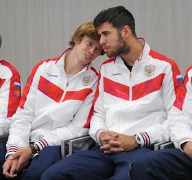 Жеребьевка матча Группы I (зона Европа/Африка) командного чемпионата мира между мужскими сборными командами на Кубок Дэвиса между сборными России и Австрии. Игроки сборной команды России Андрей Рублев (слева) и Карен Хачанов (справа) во время жеребьевки.