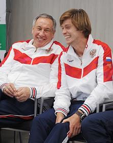 Жеребьевка матча Группы I (зона Европа/Африка) командного чемпионата мира между мужскими сборными командами на Кубок Дэвиса между сборными России и Австрии. Президент Федерации тенниса России Шамиль Тарпищев (слева) и игрок сборной команды России Андрей Рублев (справа) во время жеребьевки.