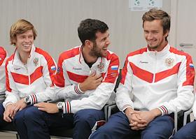 Жеребьевка матча Группы I (зона Европа/Африка) командного чемпионата мира между мужскими сборными командами на Кубок Дэвиса между сборными России и Австрии. Слева направо: игроки сборной команды России Андрей Рублев, Карен Хачанов и Даниил Медведев во время жеребьевки.