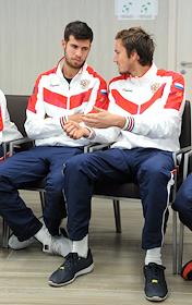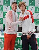 Жеребьевка матча Группы I (зона Европа/Африка) командного чемпионата мира между мужскими сборными командами на Кубок Дэвиса между сборными России и Австрии. Игрок сборной Австрии Деннис Новак (слева) и игрок сборной России Андрей Рублев (справа) во время жеребьевки.