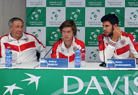 Жеребьевка матча Группы I (зона Европа/Африка) командного чемпионата мира между мужскими сборными командами на Кубок Дэвиса между сборными России и Австрии. Слева направо: президент Федерации тенниса России Шамиль Тарпищев, игроки сборной команды России Андрей Рублев и Карен Хачанов во время жеребьевки.