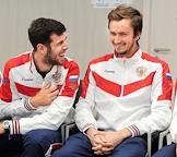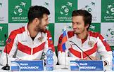 Жеребьевка матча Группы I (зона Европа/Африка) командного чемпионата мира между мужскими сборными командами на Кубок Дэвиса между сборными России и Австрии. Игрок сборной Австрии Деннис Новак (слева) и игрок сборной России Даниил Медведев (справа) во время жеребьевки.