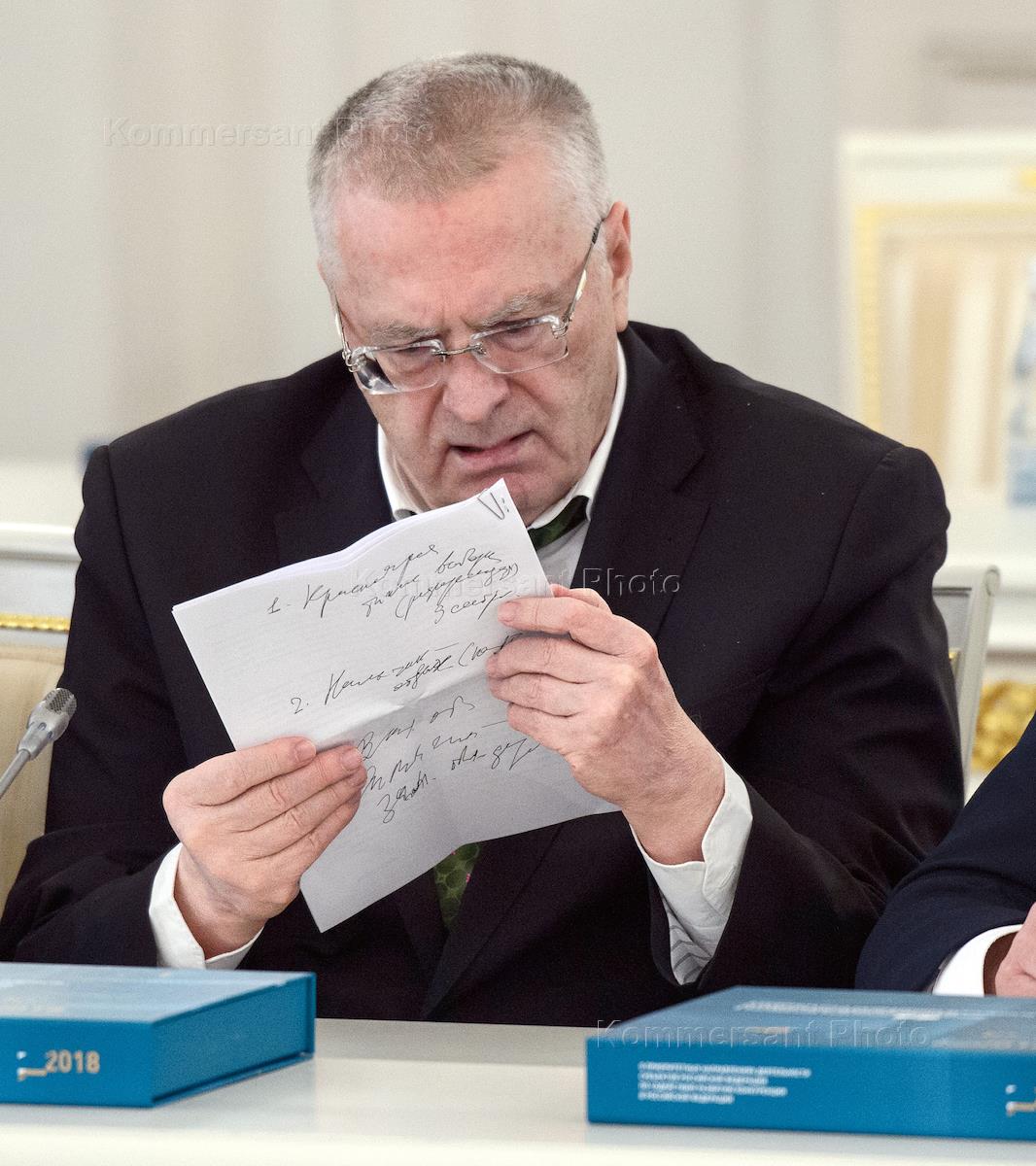 Заседание Государственного совета по вопросу развития конкуренции прошло в Георгиевском зале Большого Кремлевского дворца. Лидер Либерально-демократической партии России (ЛДПР) Владимир Жириновский перед началом заседания.