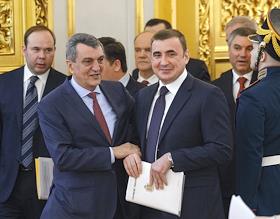 Заседание Государственного совета по вопросу развития конкуренции прошло в Георгиевском зале Большого Кремлевского дворца. Временно исполняющего обязанности главы Республики Дагестан Владимир Васильев (слева) и глава Республики Ингушетия Юнус-Бек Евкуров (справа) перед началом заседания.