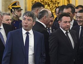 Заседание Государственного совета по вопросу развития конкуренции прошло в Георгиевском зале Большого Кремлевского дворца. Глава Республики Бурятия Алексей Цыденов (слева) и полномочный представитель президента России в Уральском федеральном округе Игорь Холманских (справа) перед началом заседания.