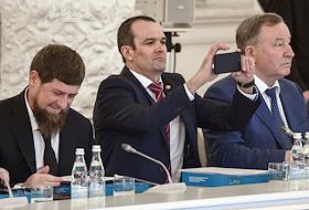 Заседание Государственного совета по вопросу развития конкуренции прошло в Георгиевском зале Большого Кремлевского дворца. Слева направо: глава Республики Ингушетия Юнус-Бек Евкуров, полномочный представитель президента России в Южном Федеральном округе Владимир Устинов временно исполняющего обязанности губернатора Кемеровской области Сергей Цивилев и глава Чеченской Республики Рамзан Кадыров перед началом заседания.