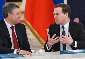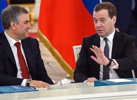 Заседание Государственного совета по вопросу развития конкуренции прошло в Георгиевском зале Большого Кремлевского дворца. Председатель Государственной думы России Вячеслав Володин (слева) и председатель правительства России Дмитрий Медведев (справа) перед началом заседания.