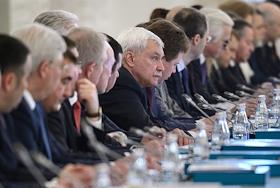 Заседание Государственного совета по вопросу развития конкуренции прошло в Георгиевском зале Большого Кремлевского дворца. Слева направо: полномочный представитель президента России в Сибирском Федеральном округе Сергей Меняйло, полномочный представитель президента России в Южном Федеральном округе Владимир Устинов и полномочный представитель президента России в Уральском Федеральном округе Игорь Холманских перед началом заседания.