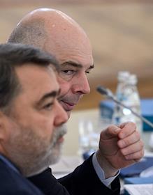 Заседание Государственного совета по вопросу развития конкуренции прошло в Георгиевском зале Большого Кремлевского дворца. Руководитель Федеральной антимонопольной службы (ФАС) России Игорь Артемьев (слева) и министр финансов России Антон Силуанов (справа) перед началом заседания.