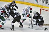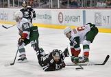 Континентальная хоккеная лига (КХЛ). Кубок Гагарина. 4-й матч финальной серии. Матч между командами "Трактор" (Челябинск) - "Ак Барс" (Казань). Игрок команды "Ак Барс" Михаил Глухов (справа), игроки команды "Трактор" Ник Бэйлен (второй слева) и Игорь Исаев (второй справа) во время матча.