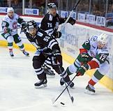 Континентальная хоккеная лига (КХЛ). Кубок Гагарина. 4-й матч финальной серии. Матч между командами "Трактор" (Челябинск) - "Ак Барс" (Казань). Игрок команды "Ак Барс" Атте Охтамаа (справа) и игрок команды "Трактор" Алексей Кручинин (слева) во время матча.