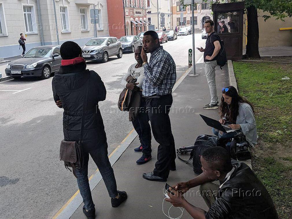 Обманутые граждане Нигерии у здания посольства Нигерии в России. Мошенники обещали устроить их на работу в России по Fan ID (паспорту болельщика).