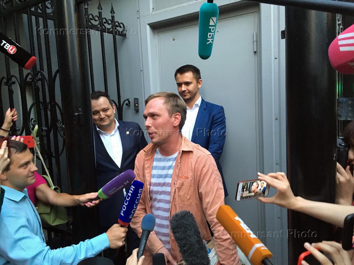 Корреспондент интернет-издания "Медуза" Ивана Голунов (в центре) во время выхода из здания главного следственного управления МВД по Москве после снятия с него всех обвинений по делу о покушении на сбыт наркотических веществ.