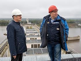 Потомственные гидроэнергетики Юрий Васильевич и Евгений Юрьевич Комраковы на крыше здания Угличской ГЭС.