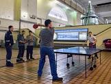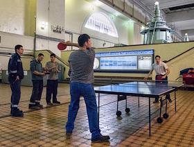 Сотрудники Нижегородской ГЭС во время игры в настольный теннис в обеденный перерыв.