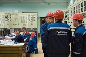 Сотрудники службы технологических систем управления (СТСУ) Нижегородской ГЭС Александр Смирнов и Андрей Болашов проверяют исправность датчика числа оборотов гидротурбины.