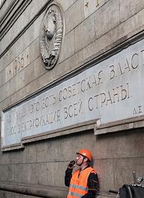Слесарь-монтажник Кузьмин Николай Владимирович по рации дает команду машинистам кранов на подъем сегментного затвора с монтажной площадки Угличской ГЭС.