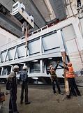Подъем нового сегментного затвора для замены на водосливной плотине Угличской ГЭС.