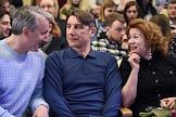 Художественный руководитель Московского театра-студии "Табакерка" Владимир Машков (слева), заместитель мэра Москвы по вопросам социального развития Леонид Печатников (в центре) и руководитель Департамента культуры города Москвы Александр Кибовский (справа) во время сбора труппы.