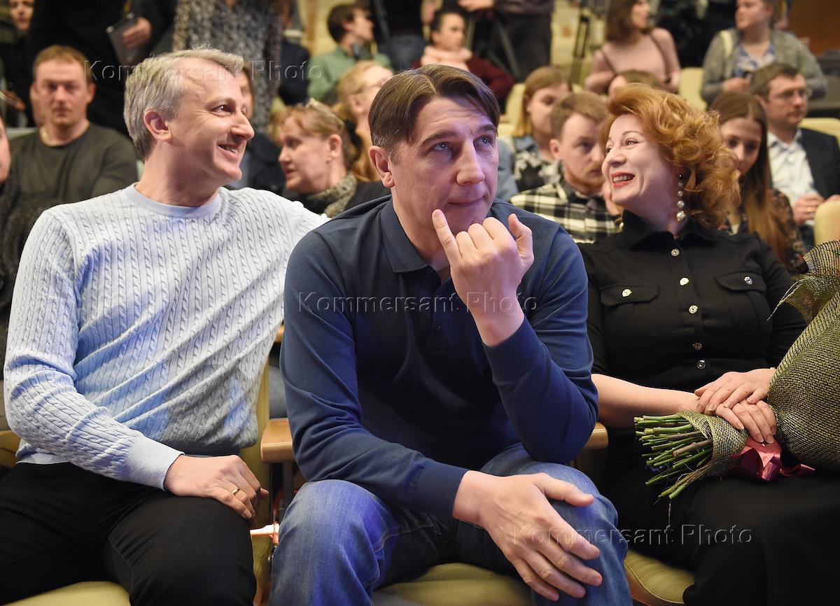 Слева направо: актеры Виталий Егоров, Сергей Угрюмов и Марианна Шульц во время сбора труппы в связи с назначением актера Владимира Машкова художественным руководителем Московского театра Олега Табакова ("Табакерка").